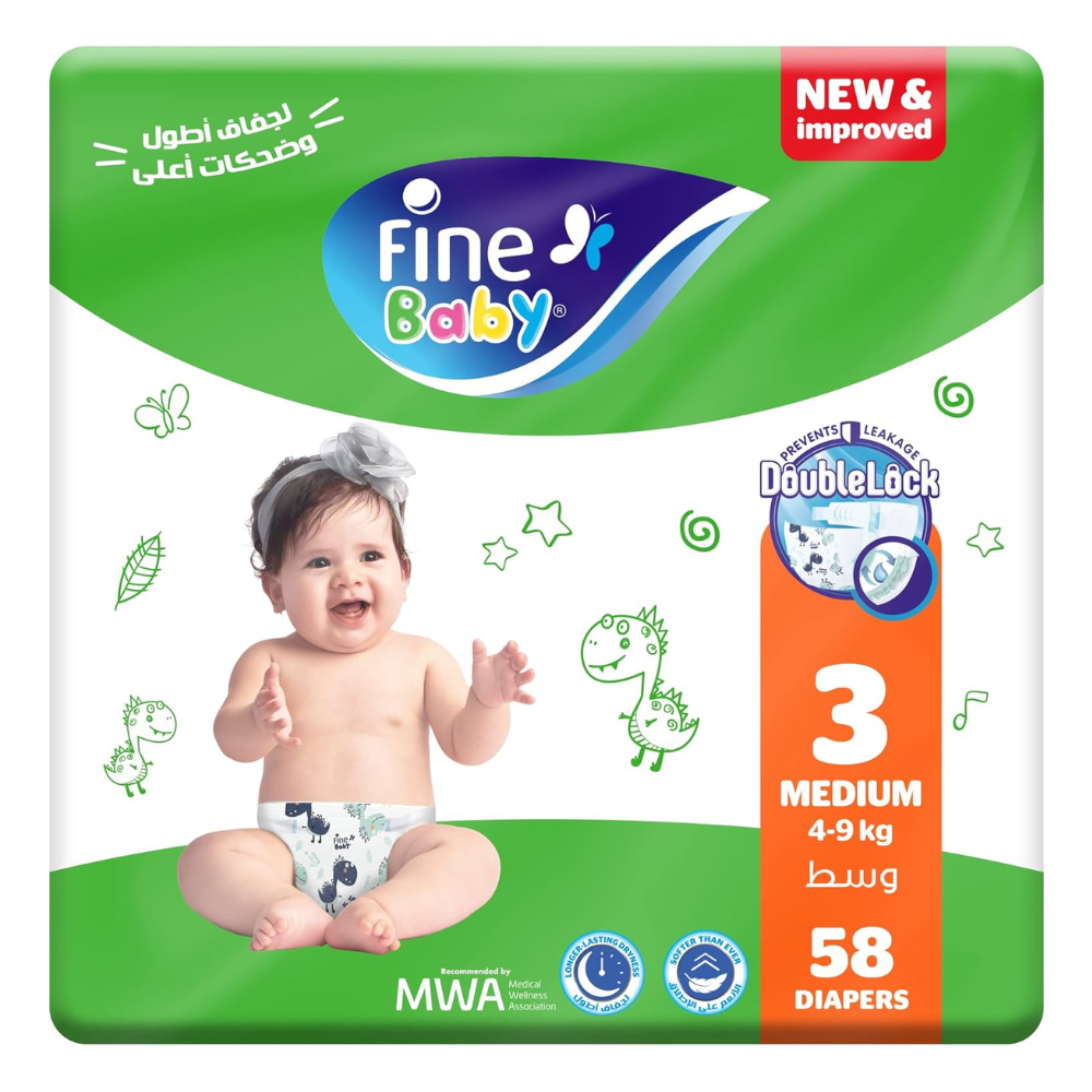 - تتميز حفاضات فاين بيبي بتقنية القفل المزدوج وجوانب مرنة وحواجز مانعة للتسرب وجزء داخلي من الجل فائق الامتصاص للمساعدة على منع التسرب وضمان راحة الطفل طوال النهار والليل.